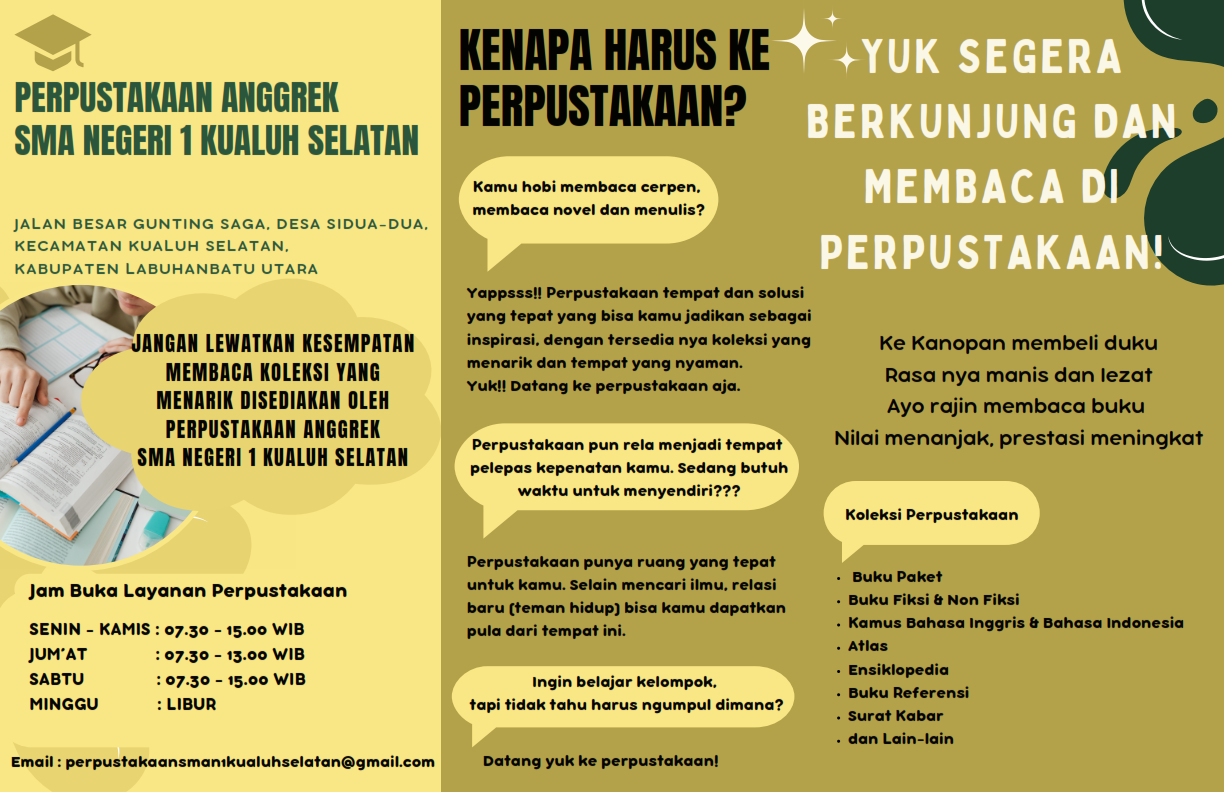 Berdasarkan pernyataan di atas, maka didirikanlah Perpustakaan Anggrek SMA Negeri 1 Kualuh Selatan bersamaan dengan berdirinya gedung SMA Negeri 1 Kualuh Selatan pada tahun 1994 dikenal dengan nama SMA Negeri 1 Kualuh Selatan (SMANSAKUSEL) yang berlokasi di Jalan Besar Gunting Saga, Desa Sidua-dua, Kecamatan Kualuh Selatan, Kabupaten Labuhanbatu Utara, Sumatera Utara. Dalam rangka mengembangkan dan meningkatkan fungsi dan peran Perpustakaan Anggrek SMA Negeri 1 Kualuh Selatan ada beberapa aspek yang berpengaruh adalah sebagai berikut :